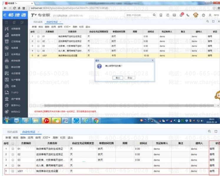 STEP7:方案设置完毕后直接点击保存,返回自动生凭证设置方案显示界面,默认方案是停用状态,需要选择该方案进行启用,使方案状态变为启用才可,如下图: