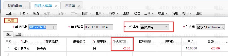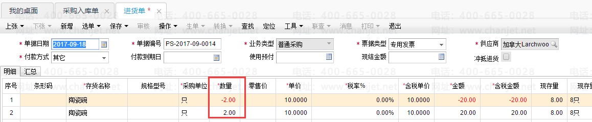 4、进货单上一正一负2条记录,金额为0。单据保存审核。