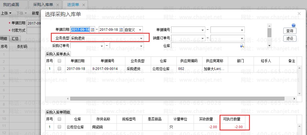 目前还没有根据蓝字采购入库单生成红字采购入库单的功能,所以发生这种情况时,通过新增一张业务类型为“采购退货”的采购入库单,再把红蓝采购入库单合并生成为一张0金额的进货单。