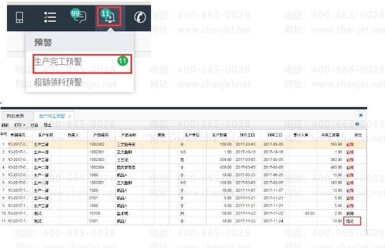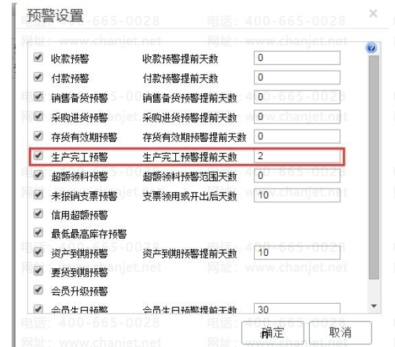 1.【系统管理】-【预警设置】,选择【生产完工预警】,设置预警提前天数。