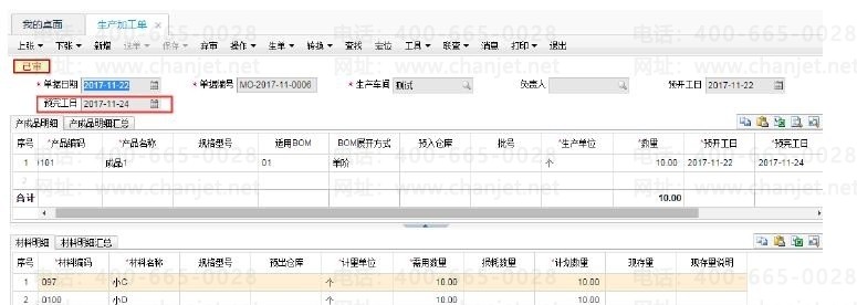 5.填制一张生产加工单,录入产品【预计完工日期】。