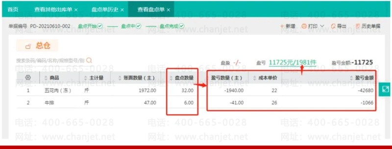 第三步:维护库存商品的“库存数量”,与系统自动提取的账簿数量进行核对,计算库存损益数据;库存清单审核后,自动生成其他收/收订单调整库存。