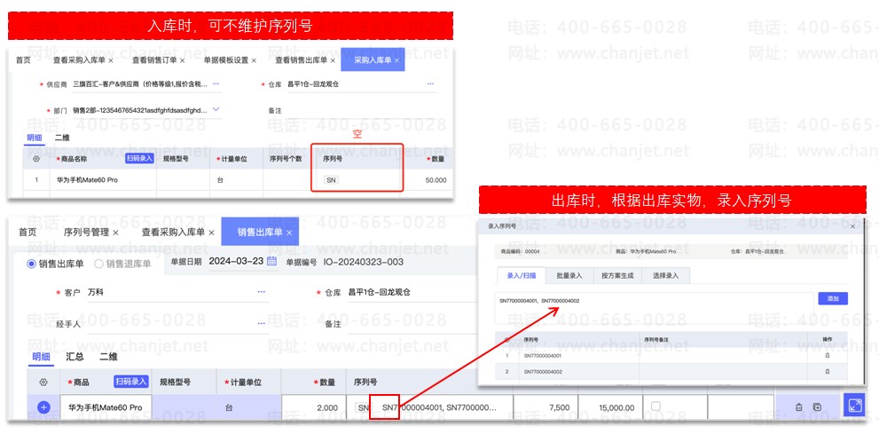 业务场景:商品采购入库时进货数量较大或入库时供应商不能马上提供该批次商品的全部序列号,因此入库时并不不记录序列号,只有在出库时,才记录序列号,用于退货、保修时确认。