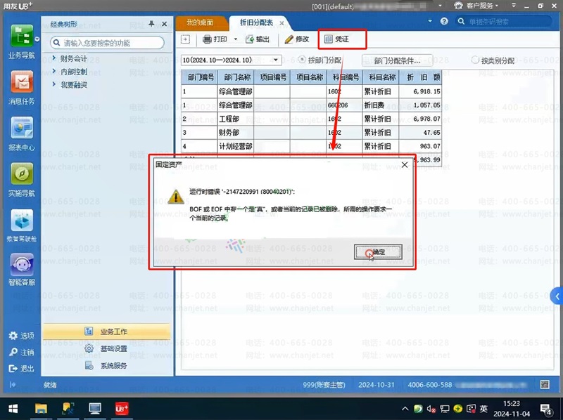 U8+18.0 版本在计提折旧分配表中点击生成凭证,提示运行时错误‘-2147220991(80010201)’:BOF或EOF中有一个是“真”,或者当前记录已被删除,所需的操作要求一个当前的记录