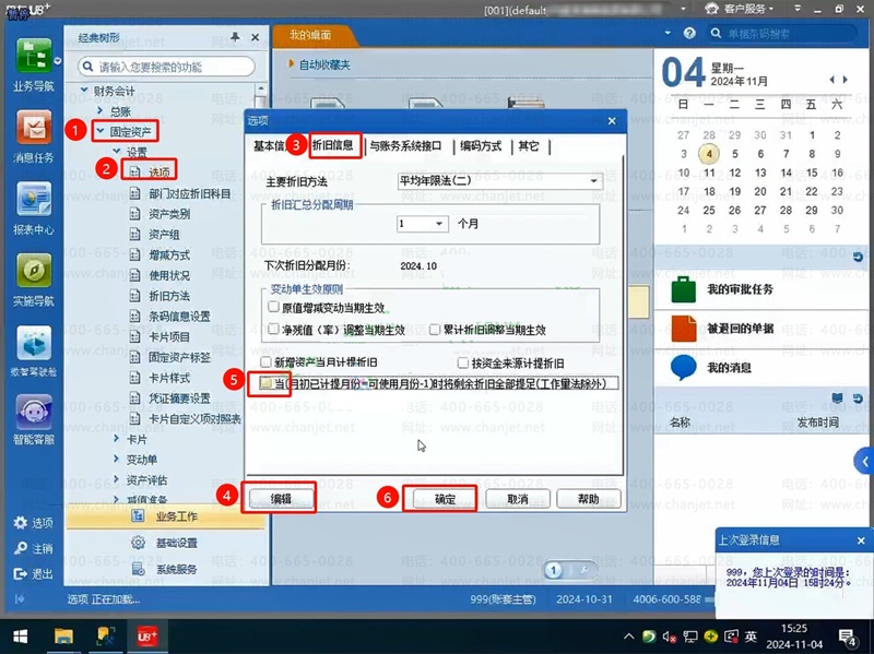 第一步:到固定资产模块中的选项设置点击折旧信息,把选项【”(当月初已计提月份=可使用月份-1)时,将剩余折旧全部提足(工作量法除外) “】取消选择,点击确定