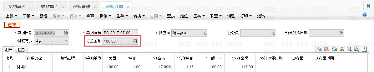 通常情况,客户下了采购订单,厂家要收一部分定金,来确保供应方开展生产业务,实际的业务,用友T+软件也比较灵活,轻松就可以实现,就是采购订单有订金金额的字段可以直接录入订金。