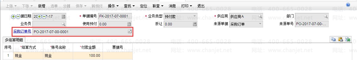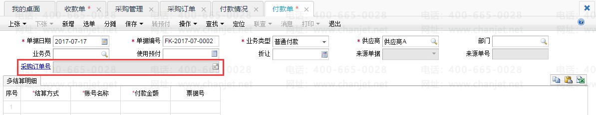 采购订单审核后自动生成付款单,与采购订单建立勾稽(联查)关系。