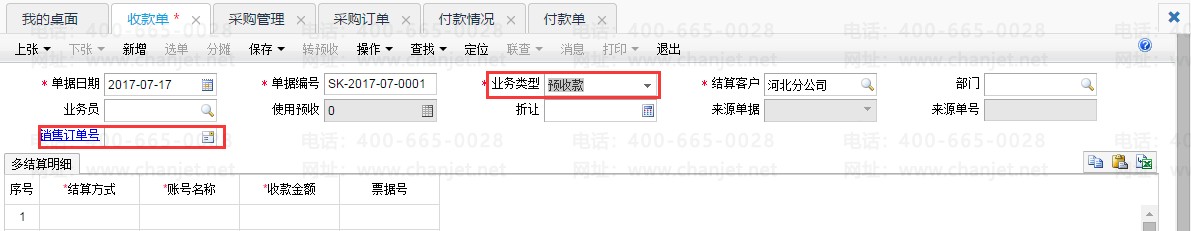 销售订单的预收款,如果是后来才收到的钱,要与销售订单建立关联关系,操作步骤类似,如下图: