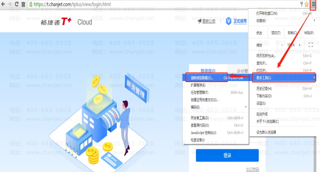 方法1、清除浏览器缓存:点击T+浏览器右上角的三个横杆,再点击【更多工具】,然后点击【清除浏览数据】;或点击【历史记录】下的【清除浏览数据】。