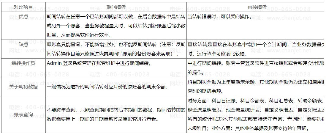 直接结转分为直接结账过渡到次年和新建会计期间过渡到次年,在数据库后台中是同一个数据库,期间结转需要进行期间结转的操作,在数据库后台中期间结转后会生成另外一个新的数据库。直接结转和期间结转具体的区别如下表所示: