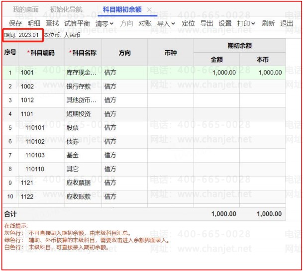 3:用新年度 2023 年的日期登入软件,查看“初始化”—“科目期初”,此时科目期初为上年度的期未余额