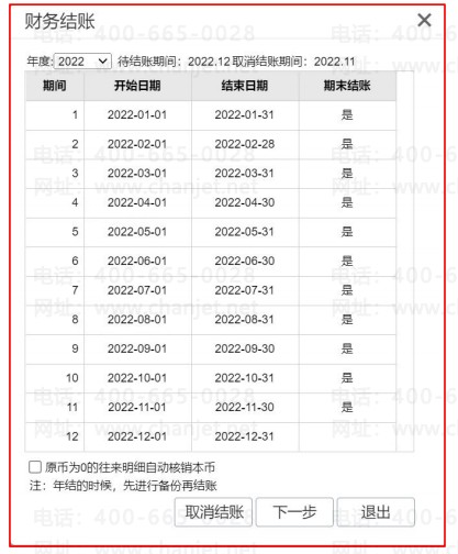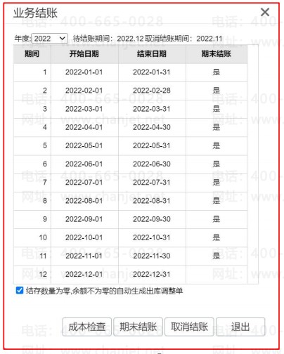 1:2022 年 12 月业务模块结账,“系统管理”—“基本设置”—“业务结账”,当业务 12月结完账时,会自动生成 2023 年的会计期间。