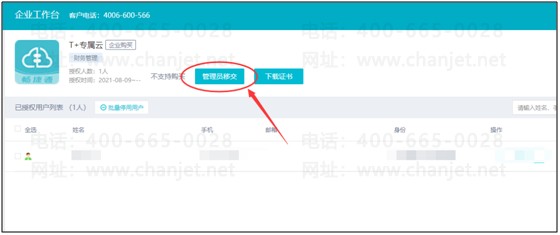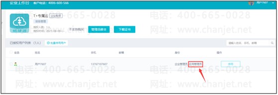 2.1如果该账号不是【应用管理员】,且显示的是其他账号才是【应用管理员】,那么用显示的畅捷通账号重新登录用友云.中国,进入【企业工作台】-【T+专属云】-【用户列表】,点击【管理员移交】,移交给购买专属云的账号。