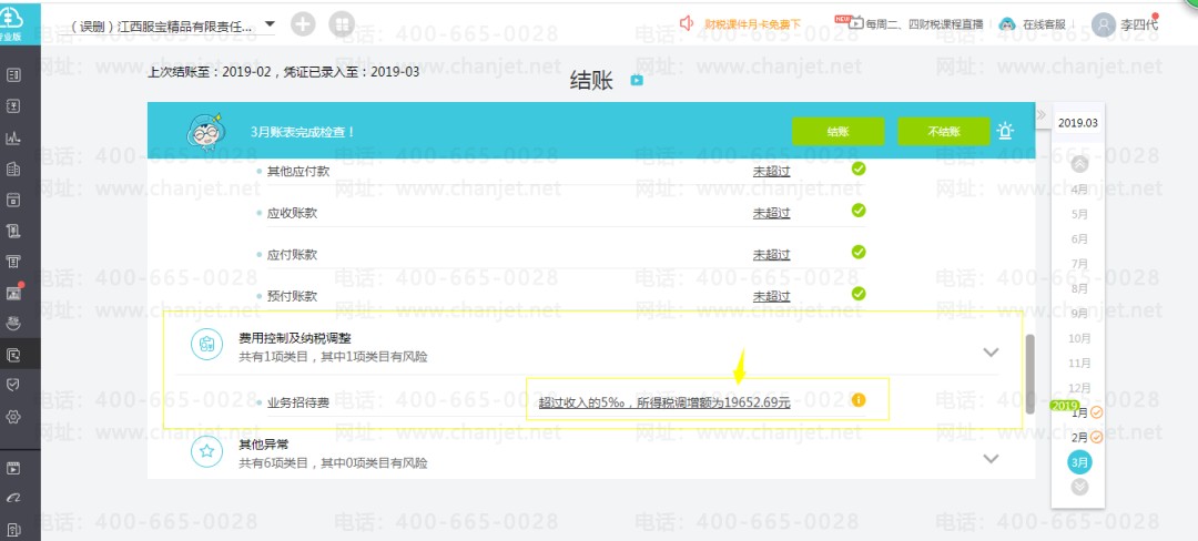 step2:进本期【结账-结账】进行“马上检查”后,系统会自动进行招待费控制及纳税调整提醒如下: