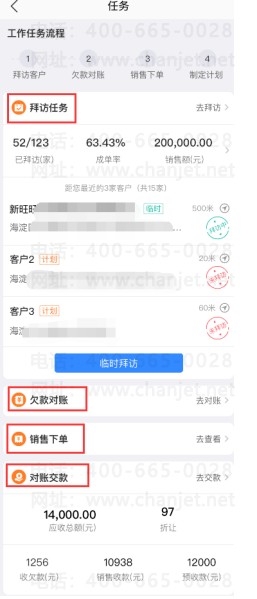 1、拜访客户:签到、拍照、销售开单、对账、收款、拜访总结