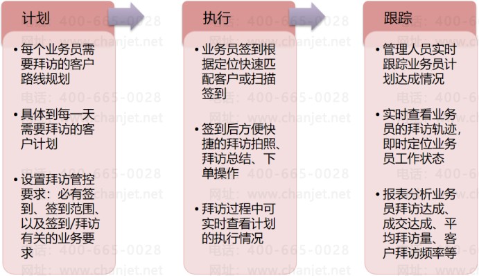 访销车销整个流程分为三步:销售经理设置拜访计划、业务员执行车销/访销、管理人员进行报表分析。