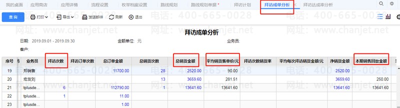 拜访结束后,管理人员可以通过报表的以下数据分析拜访效果:拜访几次,成几单,成单率,成单金额,客单价,回款额,订单周期…
