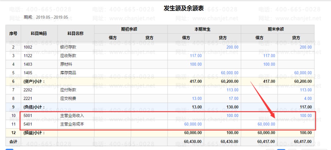 查看科目余额表如果发现损益类科目确实有余额,需要进行期间损益结转生成凭证后记账,再去试算查看报表结果。