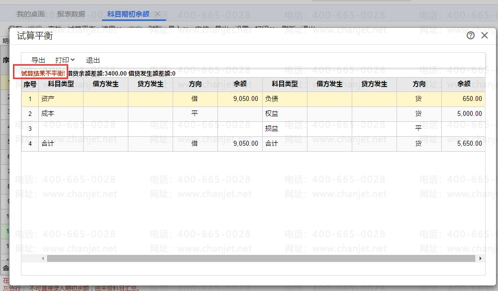 发现科目期初确实试算不平衡,并且与之前的数据核对,检查到是有个科目的期初忘记录入了,重新补录后期初后再重新试算出报表。