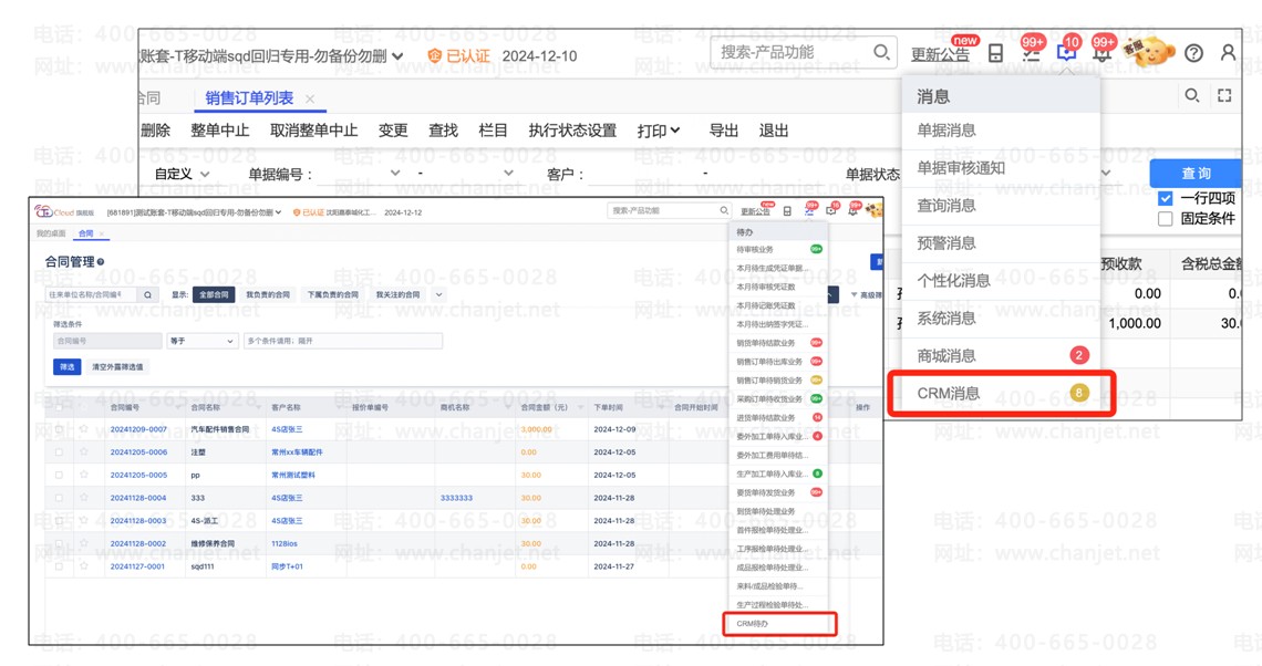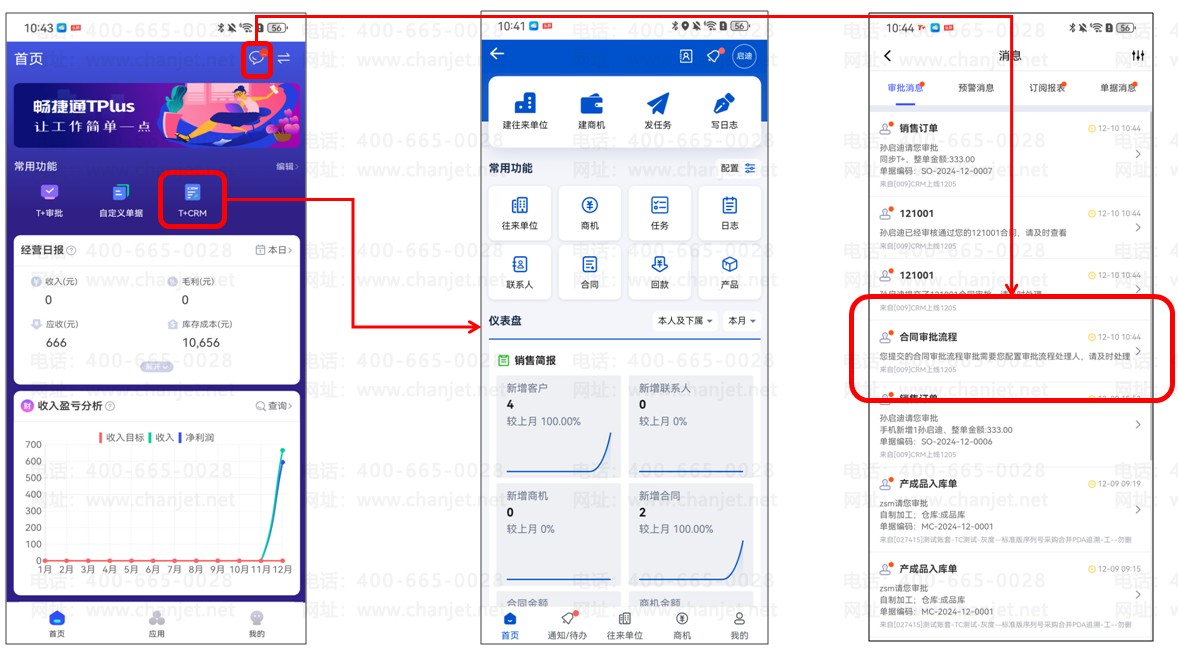 2、消息待办:在T+APP首页的消息提示框,可以接受到CRM的消息,点击后,在审批消息中可以查看合同审批等CRM发送的消息