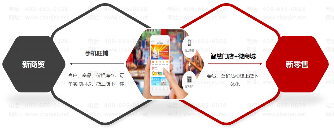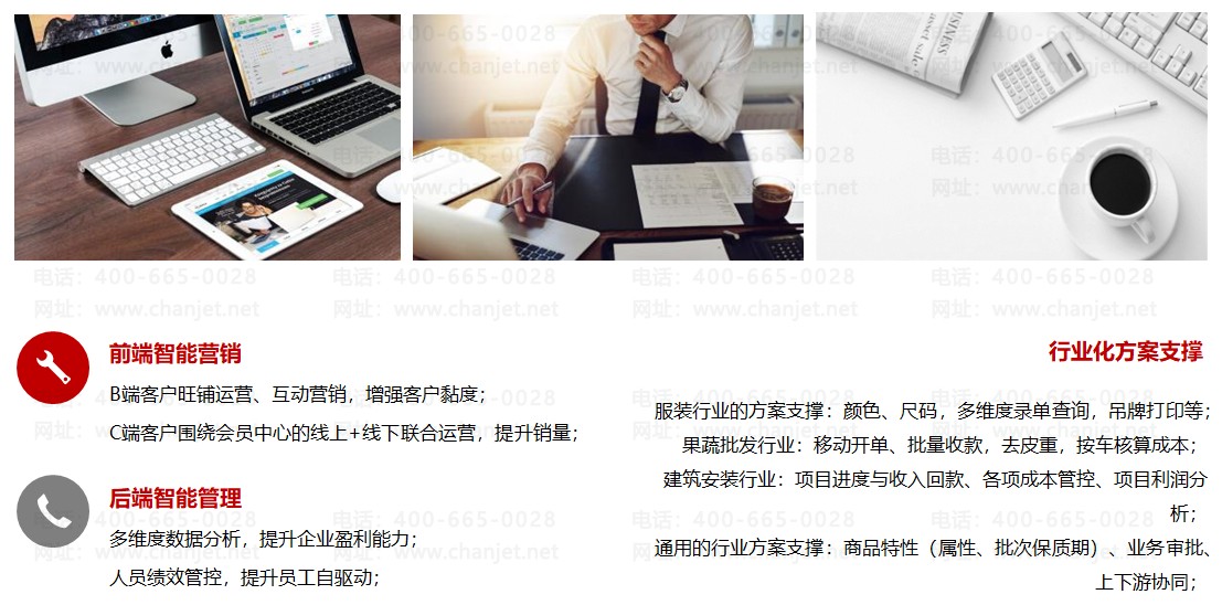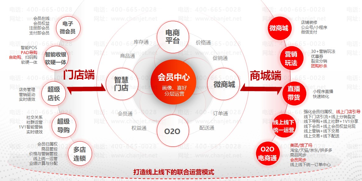 前端智慧营销(旺铺&微商城)、后端智能管理(数据分析、人员绩效)、行业化方案支撑