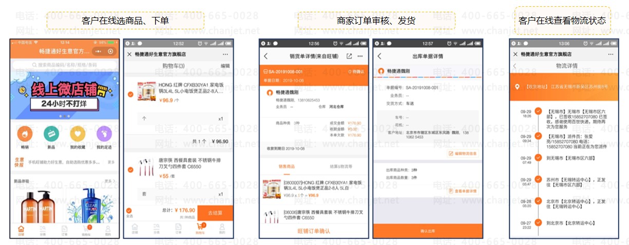 通过旺铺小程序商城,把店铺开到每个客户手机上,客户在线选商品、下单,商家按订单审核、发货,客户在线查看物流状态,省时高效。