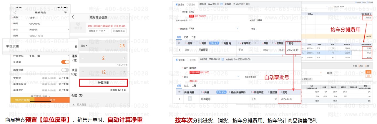 •果蔬批发行业的商家,每天到货多车次的货品,批发市场按车的吨位收取进门费,每车不一样,每辆货车的货物卖完后,也会发生各种销售费用,生鲜批发的老板都希望把费用能够分摊到每辆车上,按车核算成本和毛利。