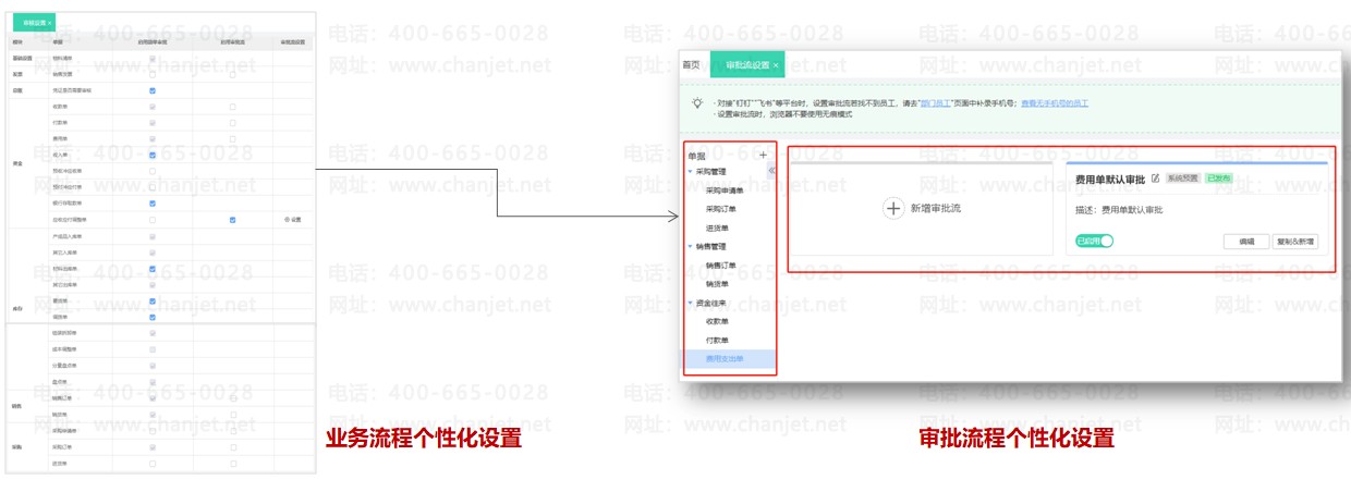 •针对企业的关键业务(采购、销售、费用支出等)不同企业业务流程不同,有些企业采购过程需要审批、有些则不需要;不同企业审批流程也不一致,需要根据企业的管理规则设置。