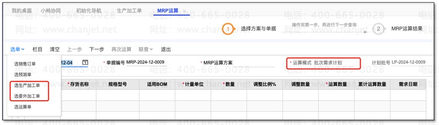 注:基于加工单运算需要用户手动选择参与运算的加工单,暂不支持在运算的计划批号内展开在途单据进行供需平衡分析(基于加工单运算,每次运算是新的计划批号)