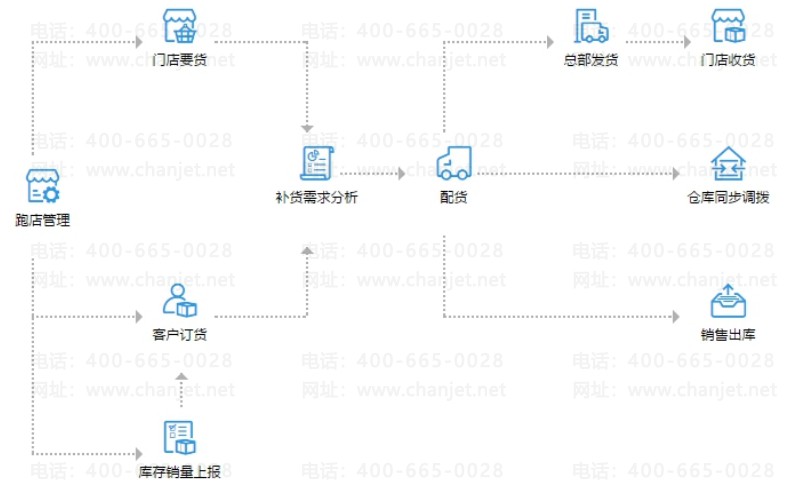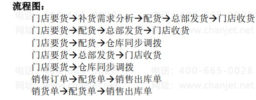门店店长根据市场销售和库存情况提出要货请求填写要货单,总部配货部门汇总多个门店的要货单,结合总部仓库的可用量,参考各门店的销量和库存情况,执行配货生成配货单。仓库管理部门看到配货部门的配货单,参照配货单生成其他出库单,拣货出库后,审核出库单,自动生成要货门店的待入库量,要货门店收到总部发出的商品后,拣货入库审核其他入库单。