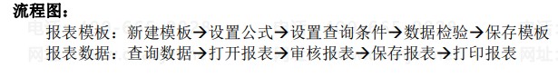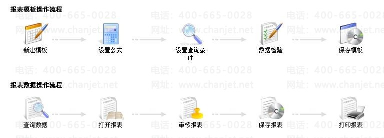 分两步,新建模板和生成报表。用户根据业务需要,新建自定义的模板,然后定义模板样式、设置公式、设置查询条件后,保存模板。在报表数据页面,选中要生成报表的节点查询数据,打开报表并审核报表,然后保存报表,根据需要选择打印。