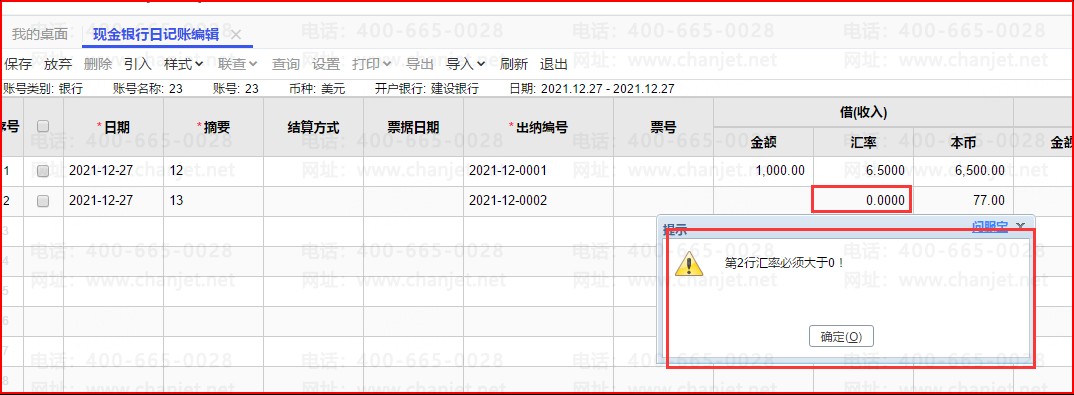 1、如果录入一行后,把汇率和金额都删除后,点击保存会提示第二行汇率必须大于0。