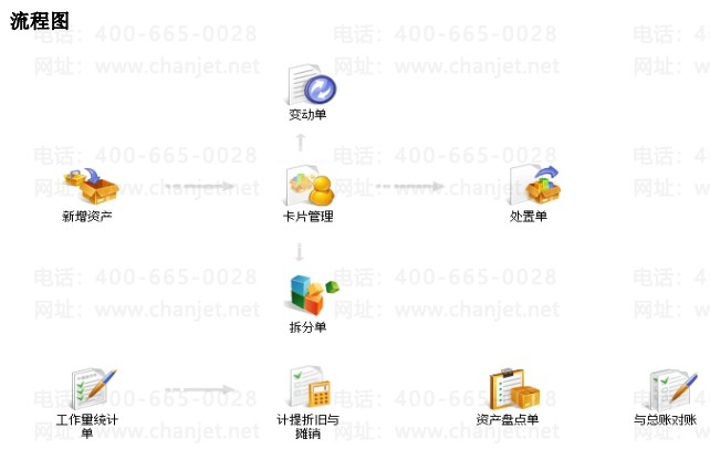 生成凭证:科目设置、摘要设置、日常业务、新增资产,变动资产的使用信息和价值信息、拆分、处置、盘点、统计工作量、计提折旧与摊销、生成凭证、与总账对账、查询报表、资产明细表、统计分析表、资产账、期末处理。