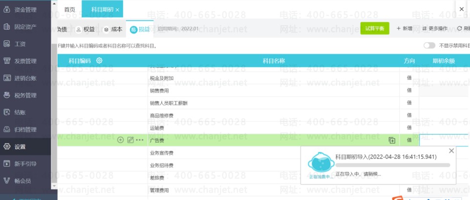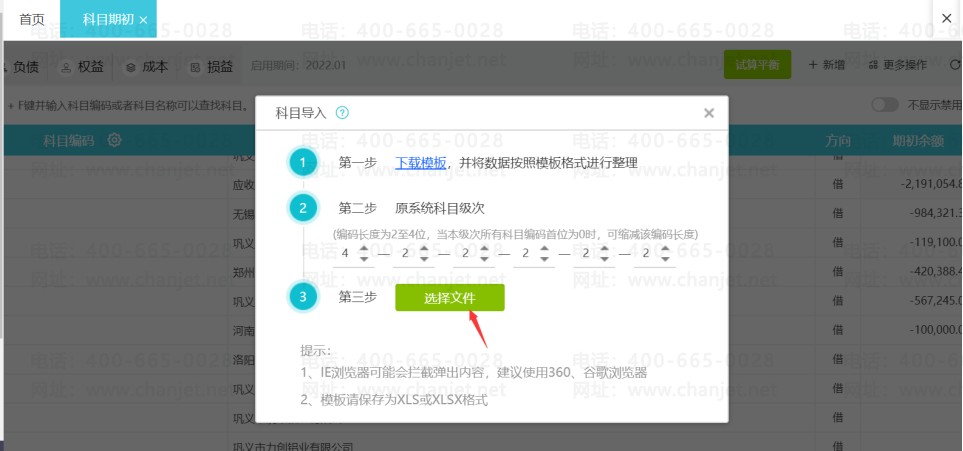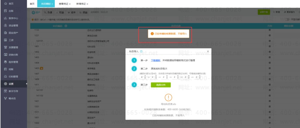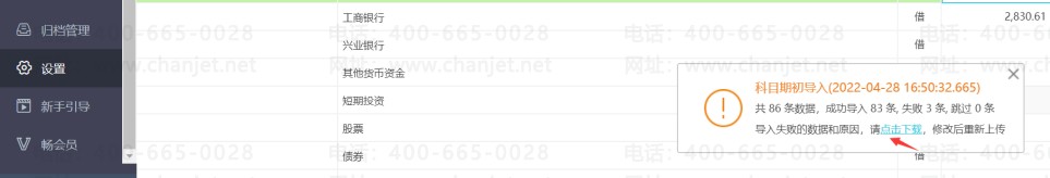 ②当导入科目表和科目期初数据有失败,可下载表格查看错误信息,错误文件可以删除错误信息后修改正确之后直接导入