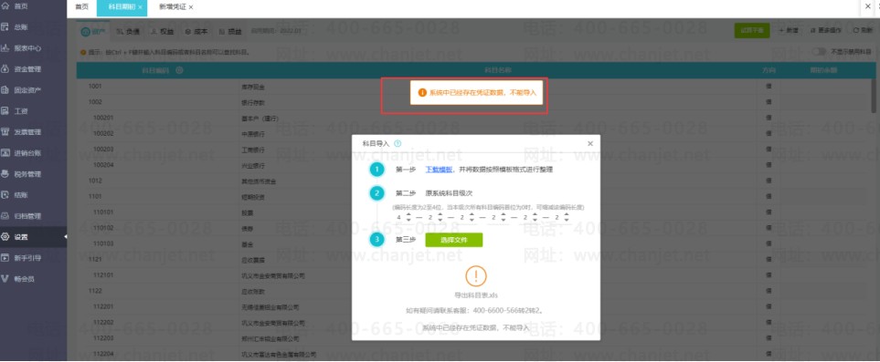 a、当导入科目表之前已经在系统使用该科目录入凭证,系统会提示:系统中已经存在凭证数据,不能导入