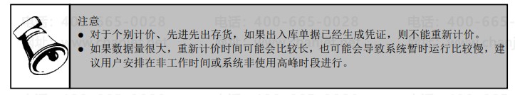 重新计价是在用户手工指定的一个范围内,由系统根据计价模式和计价方式对存货的收发存业务进行重新计价处理。重新计价是由用户操作进行的,对于“计价时机”设置为定时计价的情况,在发生了插单、改单或删单后,如果希望立即更新当前单据与后续单据的发出成本和结存成本时,可以随时手工执行重新计价功能;其他情况下,用户也可以手工执行重新计价功能。当存货为全月平均时,按重新计价界面中的仓库顺序进行各仓库的成本计算。当存货为移动平均时,则按业务发生的先后顺序进行成本计算。