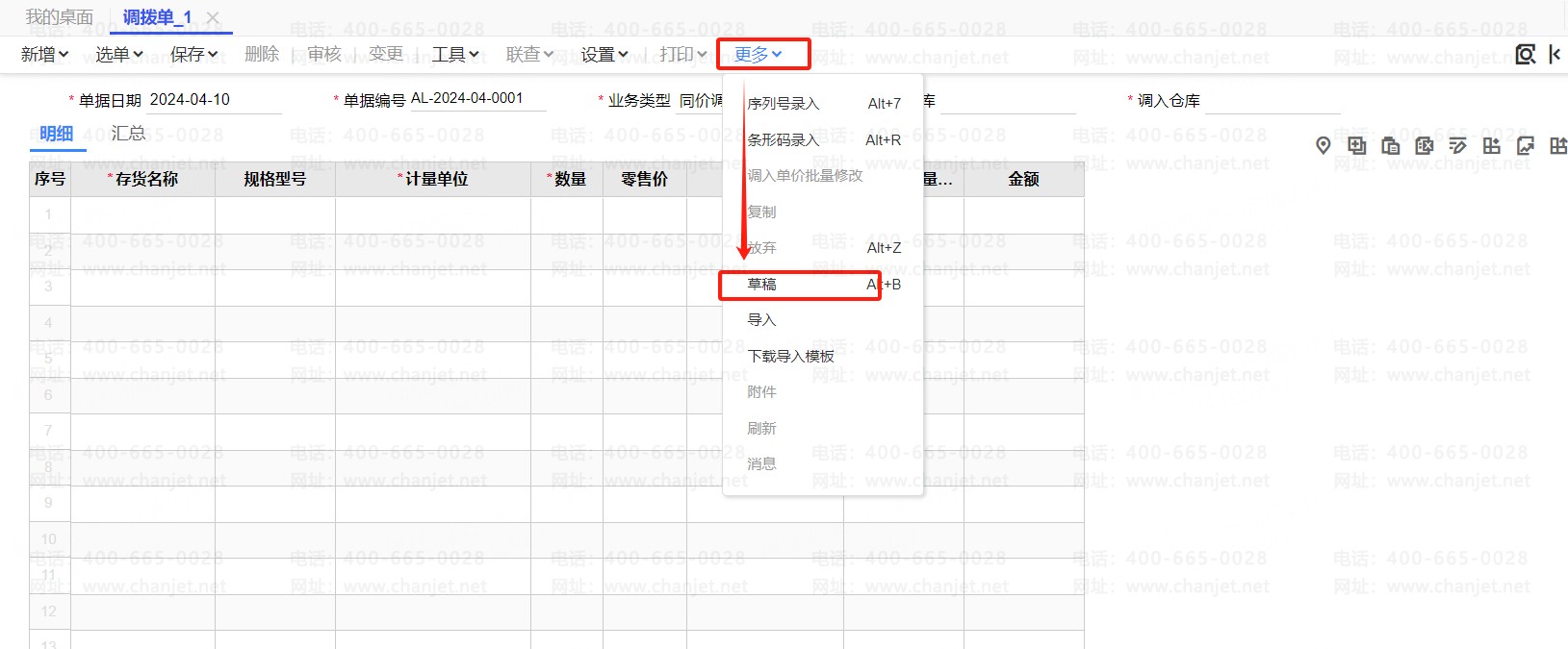 【问题答复】:调拨单草稿在更多下面查找,如图: