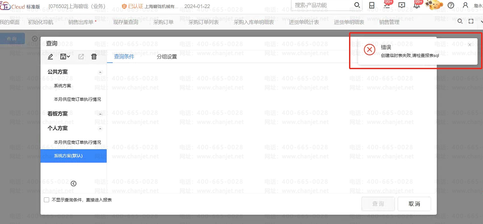 【问题详情】:T+Cloud打开采购订单执行统计表出错:提示创建临时表错误,请检查报表sql。