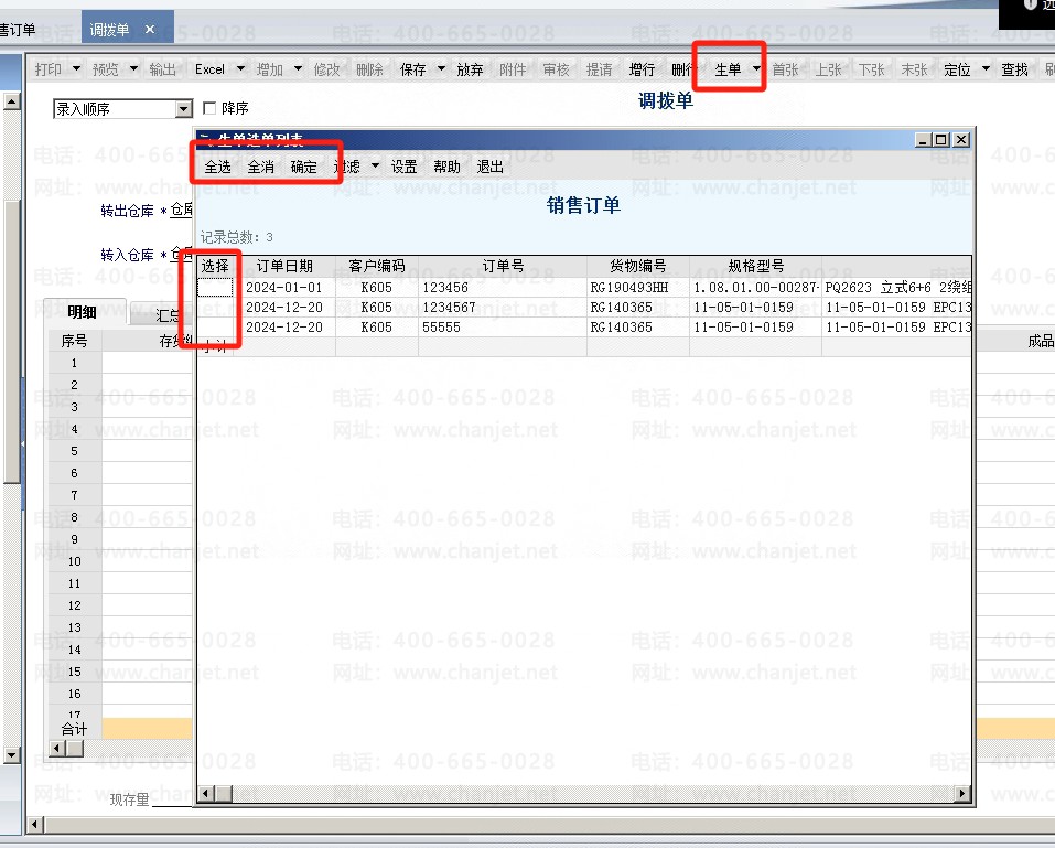 调拨单生单,选择不了销售订单(显示出来,但是无法选择),列表的选择没有Y提示,点击全选也没有反应。