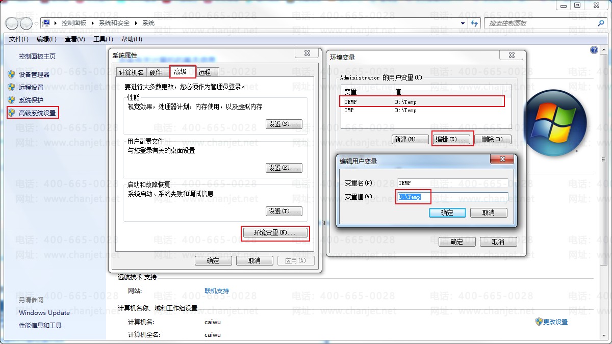 首先D盘或其它非系统盘里新建一个temp文件夹,目前我是在D盘里新建一个Temp的文件夹。然后右击我的电脑选择属性后,依次点击高级系统设置-高级-环境变量-点击TEMP-编辑-变量值V:改为Temp的目录。环境变量TMP也要改。具体看下图: