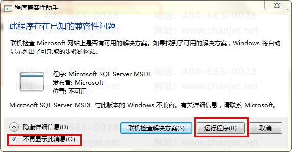 4、开始安装数据库,在安装前,先把电脑的杀毒软件跟安全卫士之类的全部关掉。双击运行setup.exe文件,在运行时会出现不兼容的提示,把不再显示此消息的框打勾,然后选择运行程序就可以了。