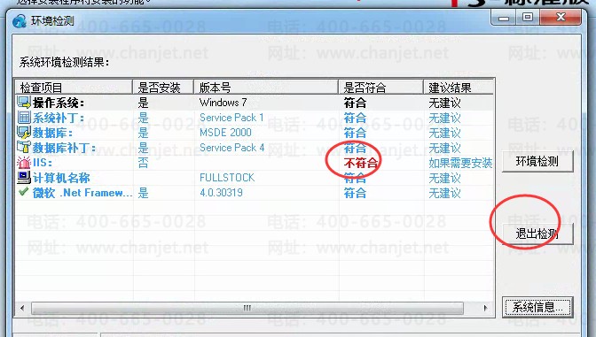 接下来会跳出环境检测的工具,如果前面的操作都是严格按照教程来的就肯定是和下图一样,只有IIS这一项检测不通过,这一项安装用友T3可以直接忽略,只要保证是如下图所示的界面就可以继续安装用友通T3财务软件,如果不是,请再从第一步开始,重新来过哦。