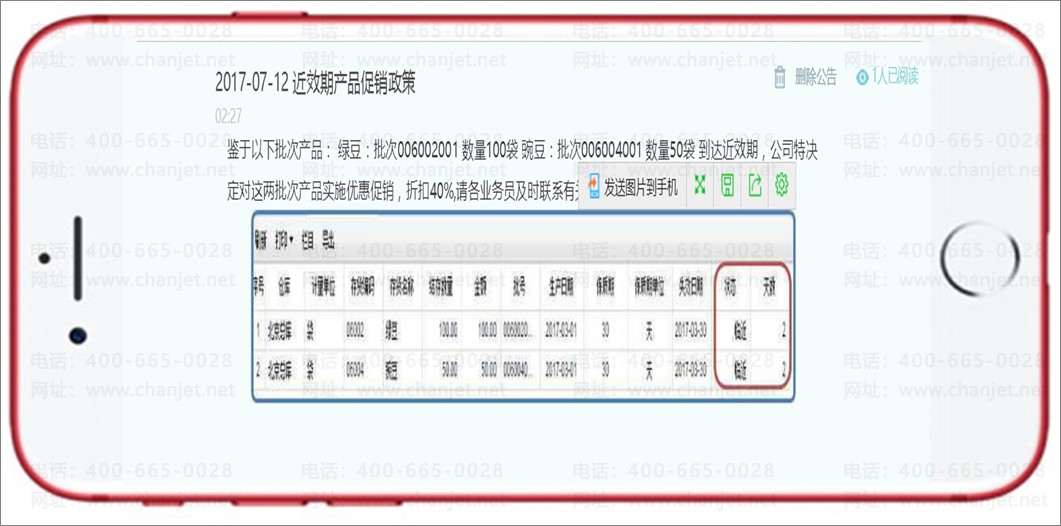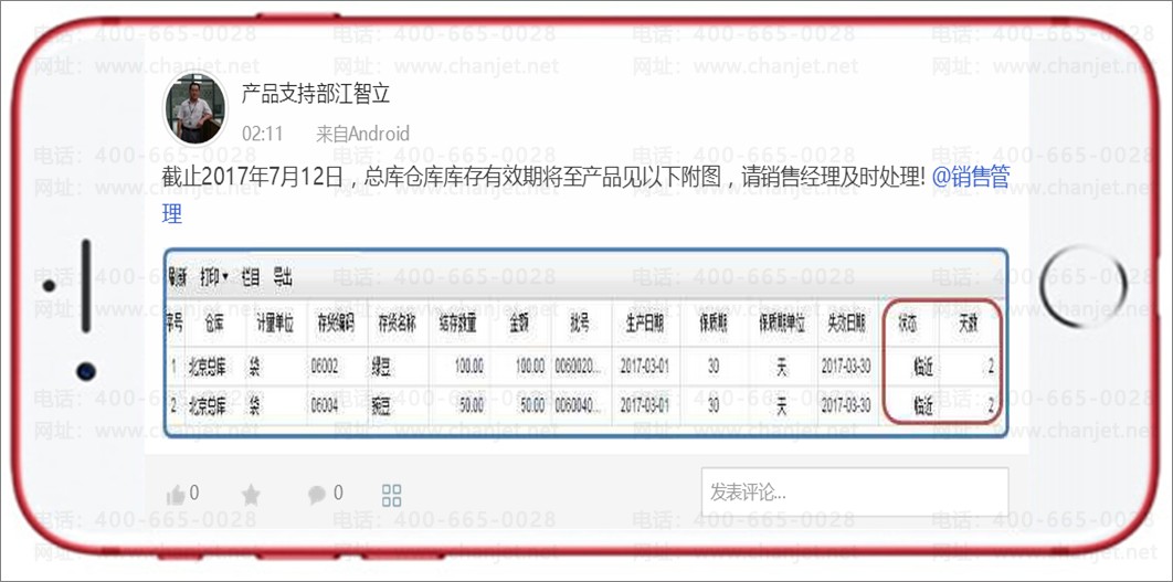 业务协同处理:当查询出近效期产品后,仓管可以发货时可优化处理,同时将信息发布到相关交流圈,销售管理看到相关信息,及时制定促销政策,并通过公告第一时间通知业务员,业务员迅速联系客户,保证近效期产品能快速得到处理。