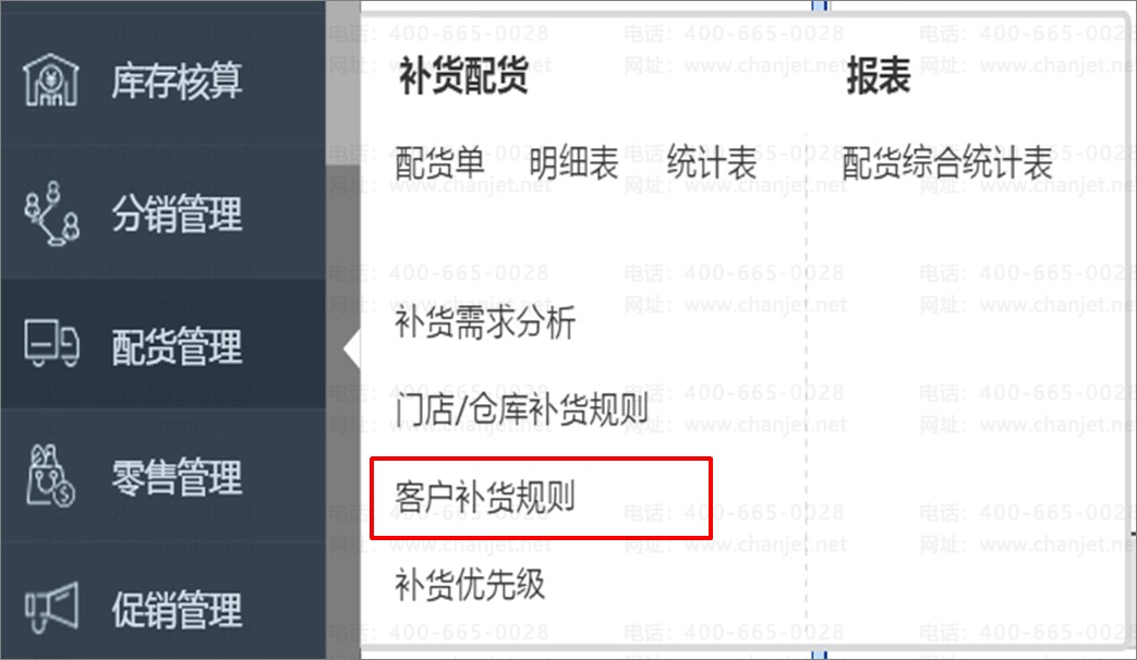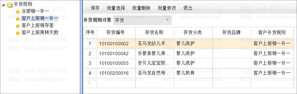 配货管理-客户补货规则:控制层在PC端为客户设置客户补货规则(销一补一、销存差、周转天数),根据补货规则,系统会自动计算建议补货数量。并批量生成配货单/出库单。