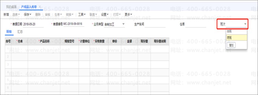 解决方案:产成品入库单上增加班次字段,分为白班和夜班两个选项。在进行产成品入库时,可以选择相应的班次录入产成品入库单。