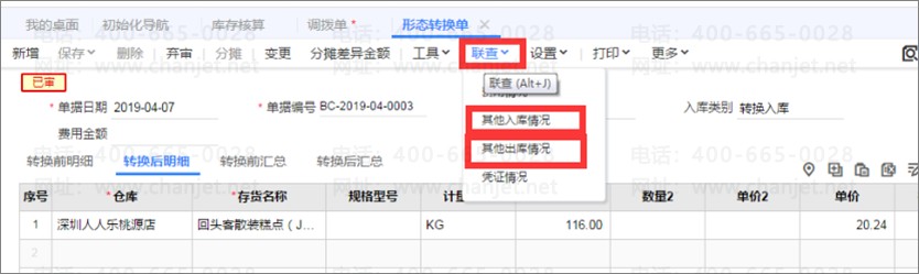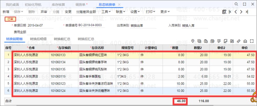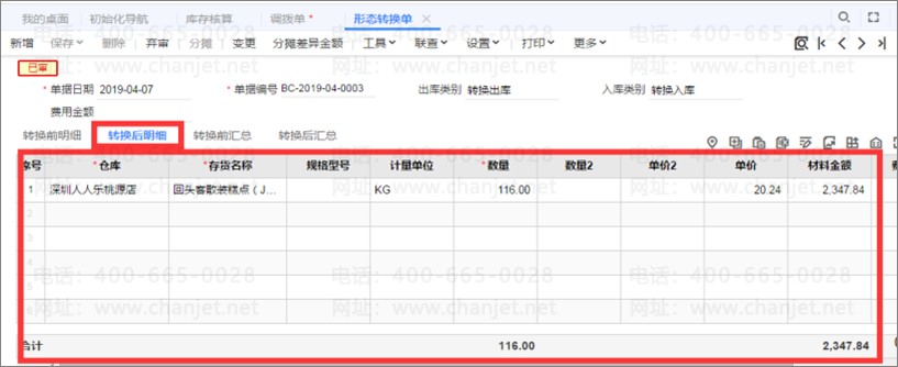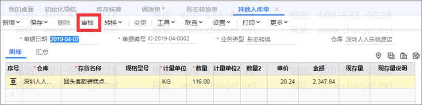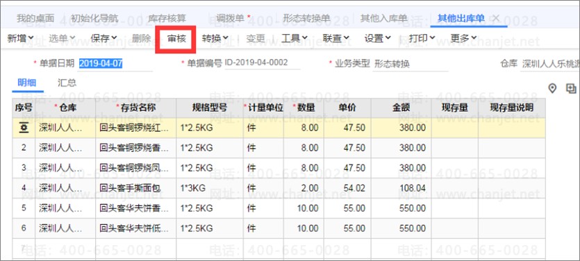 再对应到转换后的明细,数量,仓库,点击保存,审核
