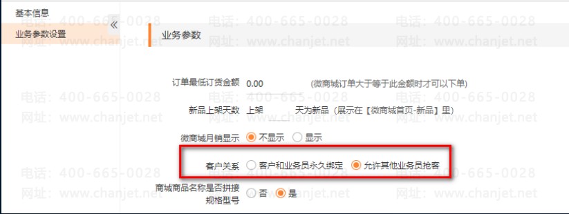企业可以根据自己的管理方式,设置客户与业务员的关系是永久绑定还是允许其他业务员抢客。