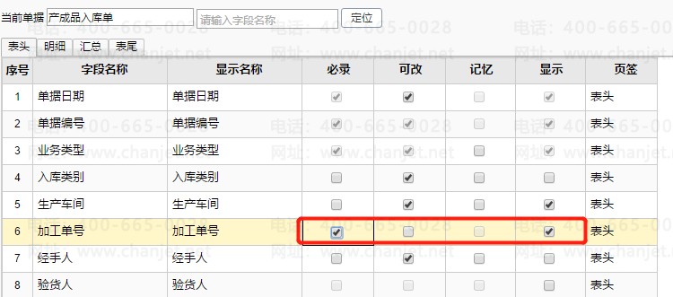 1、首先依次点击【系统管理】-【单据设计】,将产成品入库单表头的【加工单号】字段的必填勾上,并把可改的勾去掉