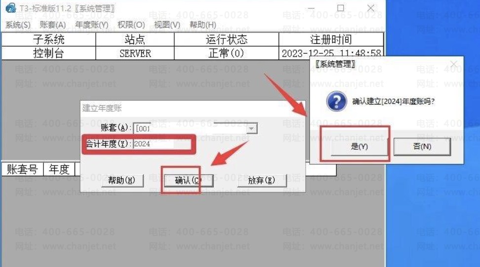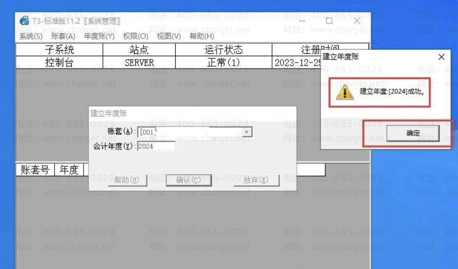 2、新建年度账:使用账套主管的账号(一般为登录用友T3的用户,或者使用demo,密码大写DEMO) 登录系统管理,选中要结转的账套登陆,选择 2023 年登陆,在年度账下点击建立,等待提示建立年度账成功。
