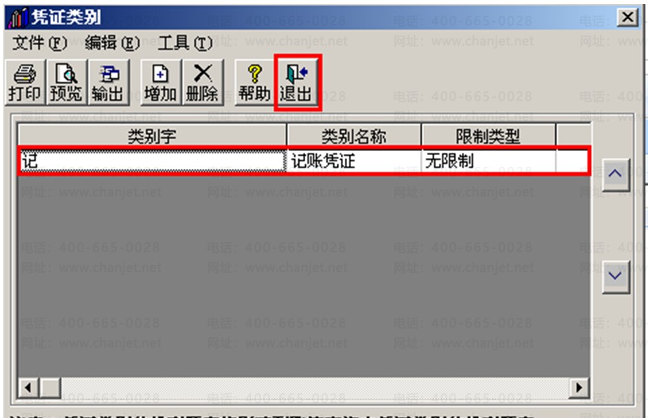 (2)点击“确定”后出现所选的凭证类别,点击“退出”就可以了。